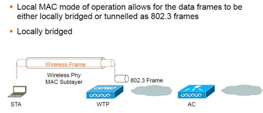- Local or Split MAC mode. In this mode, all user data traffic is tunneled to WLC